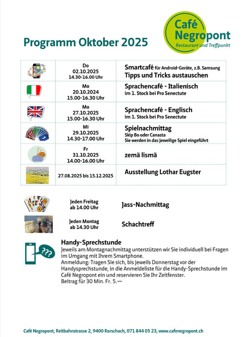 Alle Kurse und Veranstaltungen finden im Café Restaurant Negropont statt. Die Sprachencafé im ersten Stock bei Pro Senectute.